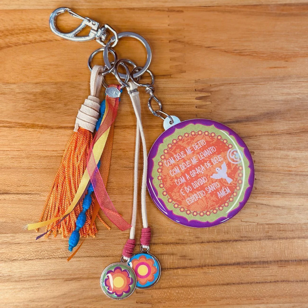 Leve a espiritualidade para o seu dia a dia com o Chaveiro com tag redonda do Espírito Santo, que traz a poderosa frase: “Com Deus me deito, com Deus me levanto, com a graça de Deus e do Espírito Santo, Amém!”