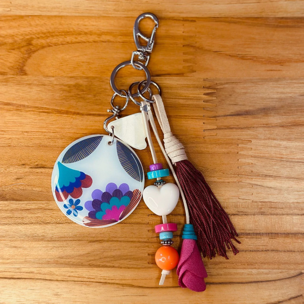 🌸 Destaques do Produto: - Pingente redondo com frase e ilustração floral delicada - Contas coloridas que trazem alegria e vivacidade - Detalhes em coração e flor artesanal que simbolizam amor e cuidado - Tassel vinho que adiciona charme e elegância ao chaveiro