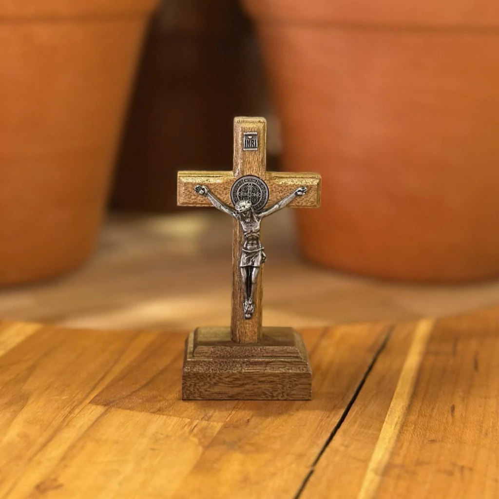 Crucifixo Madeira Tradicional 07cm para Mesa com Medalha de São Bento