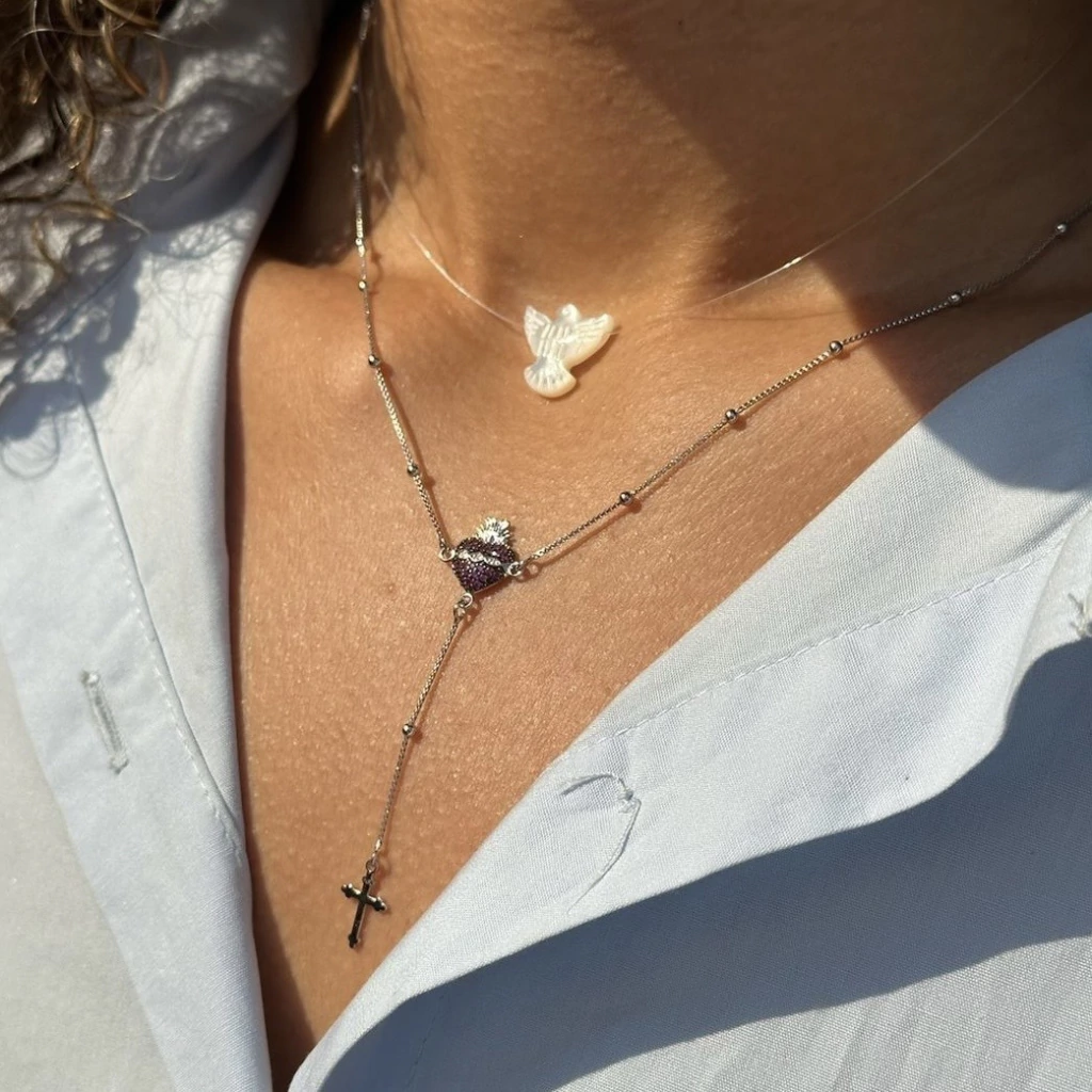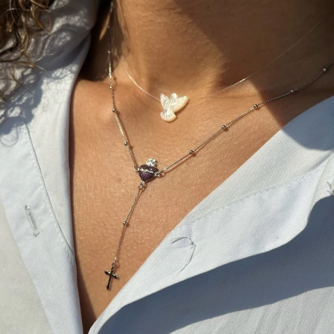 Este colar traz a paz e a luz do Espírito Santo, um amuleto que harmoniza seu visual e seu espírito.