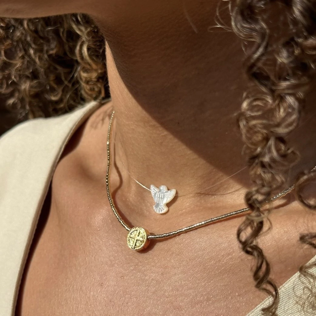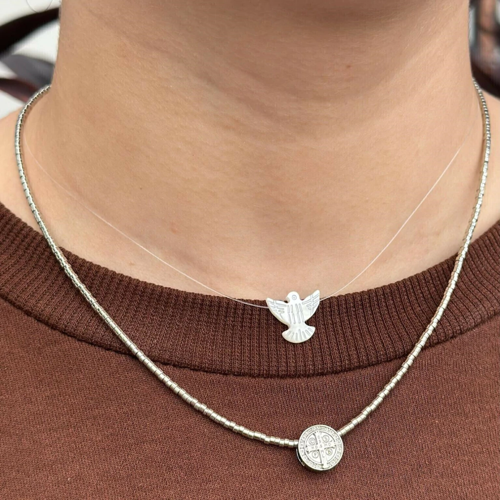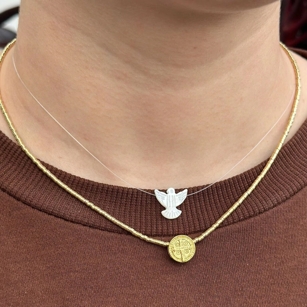 Descubra o Kit Maya com 2 Colares, um conjunto que une a delicadeza da madrepérola e a proteção da medalha de São Bento para complementar seu estilo com fé e sofisticação.